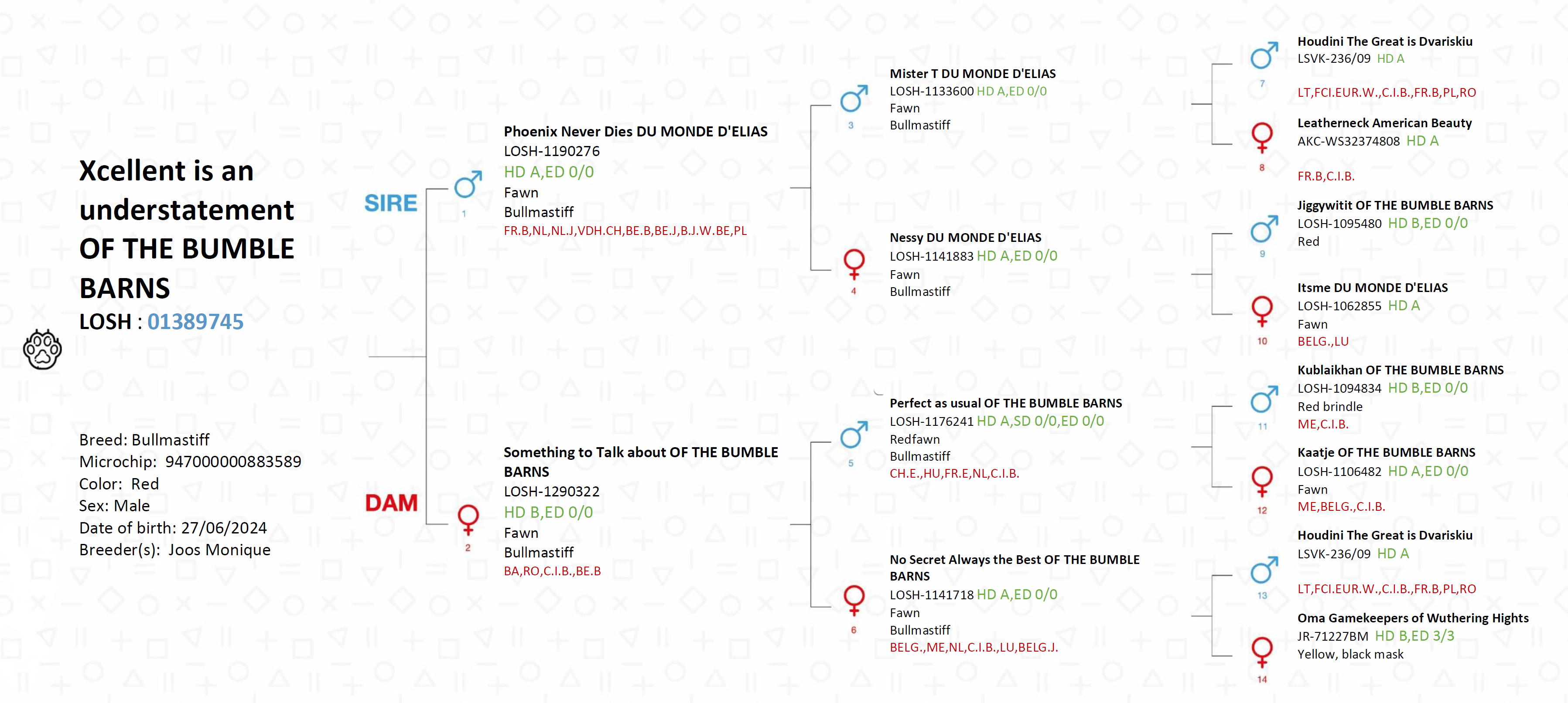 Finn is een grote forse reu, 70 cm schoft 69 kg. CFR > 0.5. super zacht karakter, met min. onder voorbeet en brede onderkaak. 6de generatie HD ED gescreend en 6de generatie Bumblebarns gefokt. Finn voldoet ruim aan de strenge Vlaamse regelgeving en is volledig off. FCI gescreend HD AA ED OO SD OO, Hart echo doppler 0, ECVO, dna mfe pra vrij, Cmr1 drager Finn dekt alleen passende teefjes cmr1 vrij.